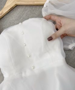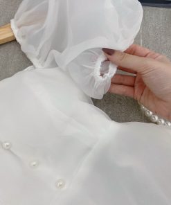 - Đầm trắng cổ vuông nút bọc tay phồng là hàng thiết kế vnxk freesize 40kg – 55kg mặc được.