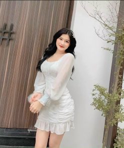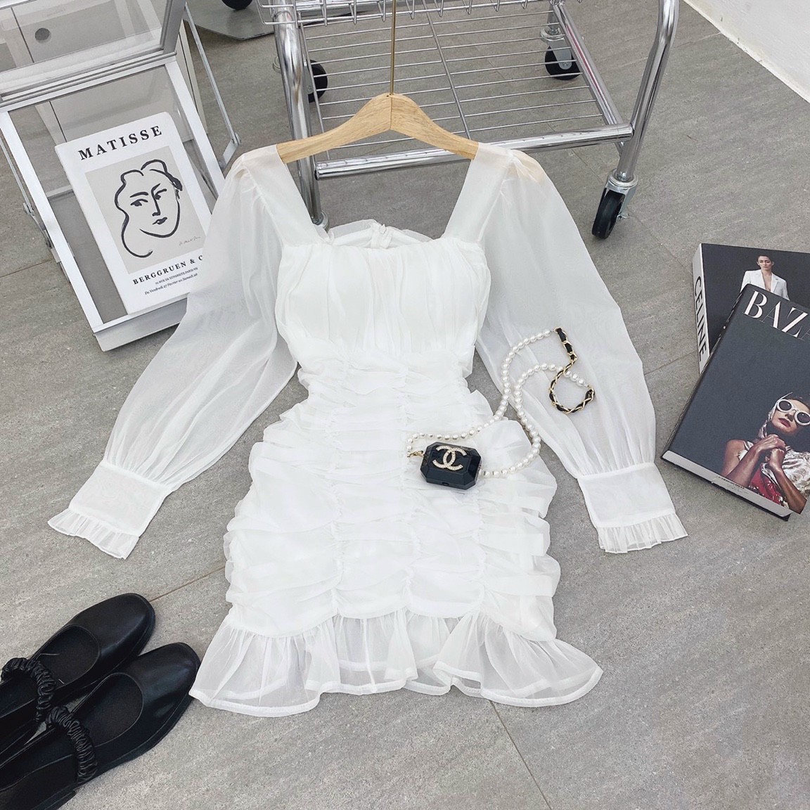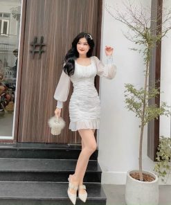 - Đầm được thiết kế nhún thân với lớp voan tại nên cảm giác nhẹ nhàng kết hợp với tone màu trắng giúp cho chiếc đầm trở nên sang trọng.
